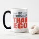 Ce modèle de tasse comporte une phrase de motivation, "SOYEZ PLUS FORT QU'EGO", affichée en caractères gras et en majuscules. La disposition du texte utilise deux couleurs pour mettre l'accent : les mots "BE STRONGER" sont dans une couleur bleu marine foncé, tandis que "THAN EGO" est dans un rouge vif. La typographie est audacieuse et affligée, ce qui lui donne une apparence robuste et impactée. Des lignes horizontales subtiles au-dessus et au-dessous de "BE STRONGER" ajoutent équilibre et structure à la conception. Ce style plairait à ceux qui recherchent une esthétique épurée et stimulante.
