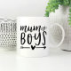 Es-tu mère d'un gamin de garçons ? Célébrez votre statut de maman avec cette mignonne tasse avec le dicton "maman des garçons" en typographie en lettres noires avec un coeur et une illustration de flèche.