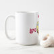 Une Mug avec l'illustration de deux chats amoureux, dormant dans leur boîte rembourrée. Des boîtes de nourriture pour chats et du lait à proximité. L'illustration est entourée du texte : "Mange Sleep Love Repeat".