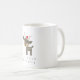 Une tasse à café mignonne et festive avec une sensation minimaliste hipster. Illustration de charme d'un cerf brun en bois portant un chapeau de santa rouge - style hipster. Texte : Mangez Boire Soyez Joyeux.