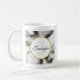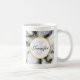 Une tasse avec une motif marbrée moderne et classe. Marbre blanc, noir et gris fumé avec de minces rubans de tourbillons en faux or dans tout le motif. Un cercle blanc avec un cadre en faux or superposé avec votre initiale monogramme et votre nom à l'intérieur.
