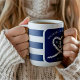 Tasse de mariage rayée bleu marine et blanc. Idéal pour un mariage Navy (militaire) ou de maison de lac. Le design présente une corde en forme de cœur avec une ancre et les initiales du couple au milieu. Personnalisez-le avec vos détails de mariage.