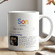 Cette tasse personnalisée intelligente et sincère est une façon parfaite de célébrer votre fils, en faisant un cadeau idéal pour son anniversaire, Noël, un jour férié spécial ou toute occasion. Le design unique imite astucieusement un moteur de recherche internet populaire, avec le mot "Son" en haut. La barre de recherche personnalisable vous permet d'entrer un terme comme "Meilleur fils" ou "Meilleur fils du monde". Personnalisez le résultat de recherche unique avec son nom, une photo, et un message affectueux et personnalisé qui met en évidence ses meilleures qualités. C'est bien plus qu'une simple tasse de café ; c'est un hommage touchant qui crée un rappel quotidien et significatif de votre lien spécial. Son esthétique moderne et spirituelle séduit tous les âges, transformant une simple pause café en un moment de chaleur et un rappel constant de votre fierté. Cette tasse est un cadeau réfléchi qu'il chérira et utilisera pendant de nombreuses années.