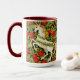 Painting of Christmas Unicorn with red poinsettia flowers, holly twigs and green leaves on a dark background.