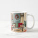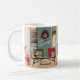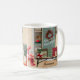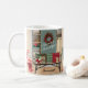 Le Merry Mudroom Scene Coffee Mug dispose d'une salle à manger pittoresque décorée pour la saison des fêtes. Il est complet avec des chandails, un casquette cowboy, une couronne et des surprises de cadeaux de Noël.