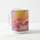 Le mur, dans l'original de ZoeSPEAK sur cette tasse inspirante, est un vieux mur de briques rouges avec une fresque sur enduit qui s'effrite. La fresque représente des nuages pouffis au coucher du soleil, tous roses et jaune vif en haut sur un ciel bleu foncé. Le message est de laisser entrer la lumière du soleil.