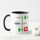 Cette tasse a un design moderne du milieu du siècle qui ressemble à un mobile avec demi-cercles, rectangle déformé, triangle, lignes et cercles en rouge, vert, turquoise, orange et noir.