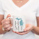Une tasse à café élégante et personnalisée présente un design typographique avec du texte "Home" et une carte de l'état du Michigan. Cliquez sur l'option Personnaliser pour déplacer le marqueur de la ville cardiaque blanche des deux côtés de la tasse. Vous pouvez le positionner directement sur la ville où vous habitez ou votre ville natale. Couleurs gris, poussiéreuses / bleu ardoise, et blanches.