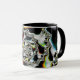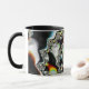 Cette tasse noire présente un art fractal en spirale psychédélique abstrait en noir et blanc avec des accents jaunes, orange, bleus et verts.