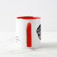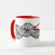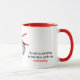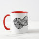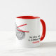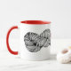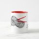 Une tasse personnalisable pour un crocheter avec les mots "Mon travail commence à interférer avec mon crochet" et décoré en noir et rouge avec une skein de laine et deux crochets.