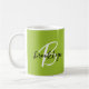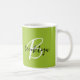 Cette élégante tasse à café personnalisée présente un monogramme et un prénom en écriture moderne noir et blanc sur un arrière - plan vert citron.