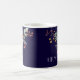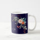 Un pulvérisateur coloré des fleurs botaniques graphiques décorent cette tasse de café et il peut être personnalisé avec trois initiales de monogramme. L'arrière - plan est un bleu marine riche.