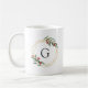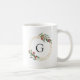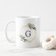 Ajoutez une bonne humeur festive à votre café, thé ou cacao du matin avec cette tasse de vacances élégante. Le design comprend votre monogramme initial unique en lettrage classique, entouré d'une fausse bordure géométrique de feuille d'or accentuée de baies d'aquarelle rouge et de feuillage botanique vert. Conçu pour coordonner avec notre collection de vacances Gemstone.