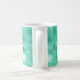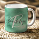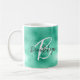 Cette élégante tasse à café personnalisée présente son monogramme et son prénom dans un script moderne blanc et gris fusain, sur un arrière - plan brillant de fausse feuille et parties scintillant vert menthe.