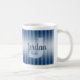 Tasse à café rayée avec nom customisé et monogramme dans les tons bleu ardoise poussiéreux, bleu nuit et bleu marine, et gris doux. Le nom et l'initiale sont facilement personnalisables ou peuvent être supprimés si désiré. Les rayures verticales classiques sont intemporelles et de bon goût. Cette simple tasse moderne fait un cadeau personnalisé élégant pour lui ou elle pour toute occasion : anniversaire, anniversaire, Noël, etc.; ou comme un groomsman ou un cadeau de demoiselle d'honneur pour un mariage aux couleurs bleues ou nautiques.