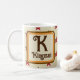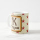Cette tasse de thé ou de café monogramme du matin est une excellente façon d'ajouter une touche colorée à votre routine matinale. Une élégante motif rose et rouge étoile s'impose face à un arrière - plan beige. La lettre "K" est présentée dans un carré avec le nom de famille des deux côtés de cette tasse. La lettre et votre nom peuvent rapidement et facilement être personnalisés. Design original - C. McGouldrick