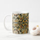 Le produit présente de superbes oeuvres d'art en mosaïque aux tons motif et terreux. Le design est symétrique, floral au centre, rayonnant vers l'extérieur avec des feuilles, des vignes et des formes ornementales. La palette de couleurs se décline dans les tons vert, beige, marron et or, créant un aspect naturel et harmonieux. L'ensemble est bordé d'un cadre rectangulaire composé de petits carreaux, apportant une touche d'exhaustivité et d'élégance. L'artisanat apparaît détaillé et sophistiqué, alliant éléments géométriques et organiques.