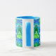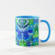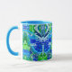 Tasse à café dans un batik motif numérique de grands papillons sur un arrière - plan médaillon arabesque orné, dans les tons bleu cobalt, turquoise et vert jade