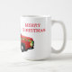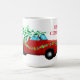 Fête de Noël tasse de café en céramique est montré avec une impression de camion rouge de fête avec Joyeux texte de Noël. Customisez cet objet ou achetez tel quel. Image stock