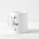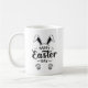 Le design inclut le texte "Joyeux jour de Pâques" dans une police décorative. Au-dessus du texte, il y a des illustrations d'oreilles de lapin, et au-dessous du texte, il y a des images d'empreintes de pattes de lapin. La tasse est placée sur une surface de couleur claire, peut-être en marbre. Le thème général est festif et lié à Pâques.