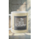 The Coffee Mug features a calm, sand-like design in warm beige and natural tones, reminiscent of fine beach or desert sand. A subtle artistic illustration is printed: a young woman sitting cross-legged in a classic yoga pose.