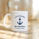 La tasse à café Nautical personnalisée dispose d'une ancre de bateau de style côtier avec un design typographique élégant. Personnalisez le texte avec le nom du capitaine, le nom du bateau et l'emplacement. Fait un cadeau amusant et unique pour les propriétaires de bateaux. Le bleu marine et le blanc sont des couleurs classiques.