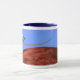 Caricature amusante d'un vaisseau spatial survolant une planète alien avec un ciel bleu vif. Idéal pour les amateurs de science-fiction.