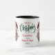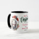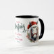 Quiconque aime les chevaux adorera cette jolie tasse de Noël. Sur les deux côtés se trouve un joli cheval blanc avec un halter rouge et chapeau de Père Noël. L'image est encadrée de bouges de pin et de baies rouges. Entre les images est un message Joyeux Noël et votre texte personnalisé. Parfait pour les enfants ou les adultes ; faites-le dire comme vous voulez !