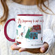 Mug cadeau 'ça va ressembler beaucoup à Noël' en style avec notre moderne festive Noël mignon chalet rouge et vert alpin chalet village avec skieurs et enfants hiver pour Noël vacances dans la nature avec la neige blanche invitation. OEuvre originale de Caroline Bonne Müller