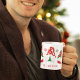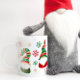 Mug de Noël personnalisé avec cinq mignons gnomes de style scandinave amusants avec un casquette rouge et vert de saison entouré de flocons de neige rouge, vert et or. Vous pouvez facilement personnaliser avec un nom en bas.