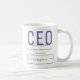 Un pdg avec votre nom, le nom de votre entreprise, le logo et sa date de création. La décoration est dans les tons violet et noir. Ajoutez simplement vos informations, ajoutez cette tasse à votre panier et buvez votre café comme le patron que vous êtes.