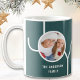 Cette tasse de Noël de gardienne élégante est décorée avec le mot JOY sur un arrière - plan vert. Facilement personnalisable avec votre photo et votre nom.