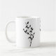 Cette tasse assez noire et blanche comporte les silhouettes des grackles étés perché sur une branche d'arbre.