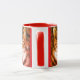 Striped cat on mug with red trim. Art by Patricia Villa.