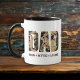 "DAD" dit cette tasse de café en motif vert et tan camouflage. Sous le texte stylisé est "Man Myth Legend". L'image est imprimée deux fois sur la tasse, avec trois champs de texte personnalisés en noir entre eux. Parfait pour la Fête des pères ou son anniversaire !