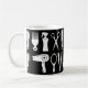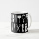 Coiffeuse / Coiffeuse Styliste salon thème tasses à café montrant des outils du métier comme un peigne, sèche-cheveux, dépliants et épingles à cheveux