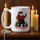 This image features a rugged, Western-style Santa wearing a cowboy hat, a long red duster coat, and denim pants. He stands between two small Christmas trees, holding a red ornament aloft, which he appears to be threading or hanging with a piece of wire. This unique portrayal gives Santa a tough, outlaw or trail rider persona. The text "Merry Christmas" is displayed prominently beneath his feet, blending the rugged look with classic holiday cheer.