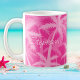 Cette tasse moderne et branchée présente un design de palmiers tropicaux dans les tons roses chauds, magenta et fuchsia. Personnalisez la typographie de script avec votre nom ou monogramme.