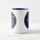 Mug avec le symbole zodiaque pour Léo en bleu argenté doux, comme un médaillon rond, recouvert d'étoiles de la constellation, contre un arrière - plan ciel étoilé classé de bleu profond de minuit à noir.