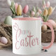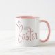Cette simple adorable tasse de Pâques à deux tons dit Happy Pâques dans un script rétro rose pastel et bleu avec une mignonne paire d'oreilles lapins lapin au-dessus du 'E' à Pâques.