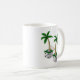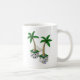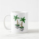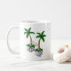 Deux dés blancs avec des palmiers qui poussent au sommet, reliés par un hamac. Les arbres sont également entourés d'herbe et de bassins d'eau qui se déversent sur les côtés des dés.