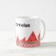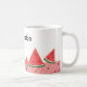 Tranches de pastèque fraîches mûres avec chair rose, graines noires et rince vert foncé sur un design rose doux le long du fond. Le mot "pastèque" peut être changé si vous le souhaitez.