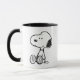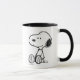 Cette oeuvre Peanuts présente Snoopy assise sur l'arrière - plan de bandes dessinées Charles M. Schulz en noir et blanc.