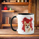 Un beau portrait couleur eau d'un Pembroke se distingue par un arrière - plan abstrait de peinture rouge vif. L'image est sur deux côtés de la tasse, avec votre nom ou autre texte personnalisé en noir entre eux.