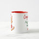 Celebrate the season or a special achievement with this adorable customizable two-tone mug. The design features a charming, happy cartoon kitten dressed in a Santa Claus outfit (hat and coat), radiating holiday cheer. On the reverse side, a festive message reads "Congratulations! May your holidays be merry & bright!" with a space below to personalize it with a name or short message, making it a truly unique keepsake. The mug features a vibrant red interior and handle, contrasting beautifully with the white exterior. It's the perfect size for coffee, tea, or cocoa, and makes an excellent gift for cat lovers, coworkers, or family members to mark a special occasion during the holiday season.