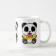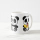 Trois adorables petits pandas assis les uns à côté des autres. Un heureux panda porte un tee - shirt avec "I heart panda" écrit dessus. Un autre propose un bâton de bambou vert à un troisième panda qui s'est endormi.
