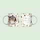 Une tasse de Noël moderne et élégante avec une citation délicate et douce "Joyeux Noël", textes customisés en cercle blanc simple et photo de famille que vous pouvez personnaliser. Son arrière - plan est un motif boho chic de boho aquarelle botanique, feuillage, cônes de pin, feuilles de pin, baies et coton donnant une ambiance chaleureuse vintage cottage coeur vacances.