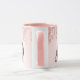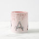 Une tasse monogrammée fillette et tendance. Arrière - plan rose vif féminine décorée de gouttes de faux rose. Personnalisez et ajoutez un nom et une lettre monogramme. Ajoutez votre propre photo x 2. Lettres noires et grises. Le nom est écrit avec un script de style moderne écrit à la main.