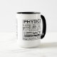 Physique Mug. Avec les mots suivants à l'arrière - Physique, Accélération, Masse, Particules, Thermodynamique, Gravité, Gros Bond, trous noirs, électromagnétique, maxwell, mécanique quantique, cordes, radiation, tesla, force, e=mc2, gaz, atome, proton, nucléaire, hertz, radiation, gamma, absolu 0, nanotechnologie, orbite, fréquence, poids