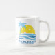 Une tasse à café amusante avec un pickleball "soleil" encadré par un palmier tropical et des vagues bleues de l'océan. Ajoutez votre texte personnalisé ci-dessous - nom du club, date/lieu du week-end de pickleball, nom du tournoi, nom du joueur, etc. Fait un cadeau parfait pour tout joueur de pickleball, organisateur de club ou prix spécial pour un gagnant du tournoi de pickleball.